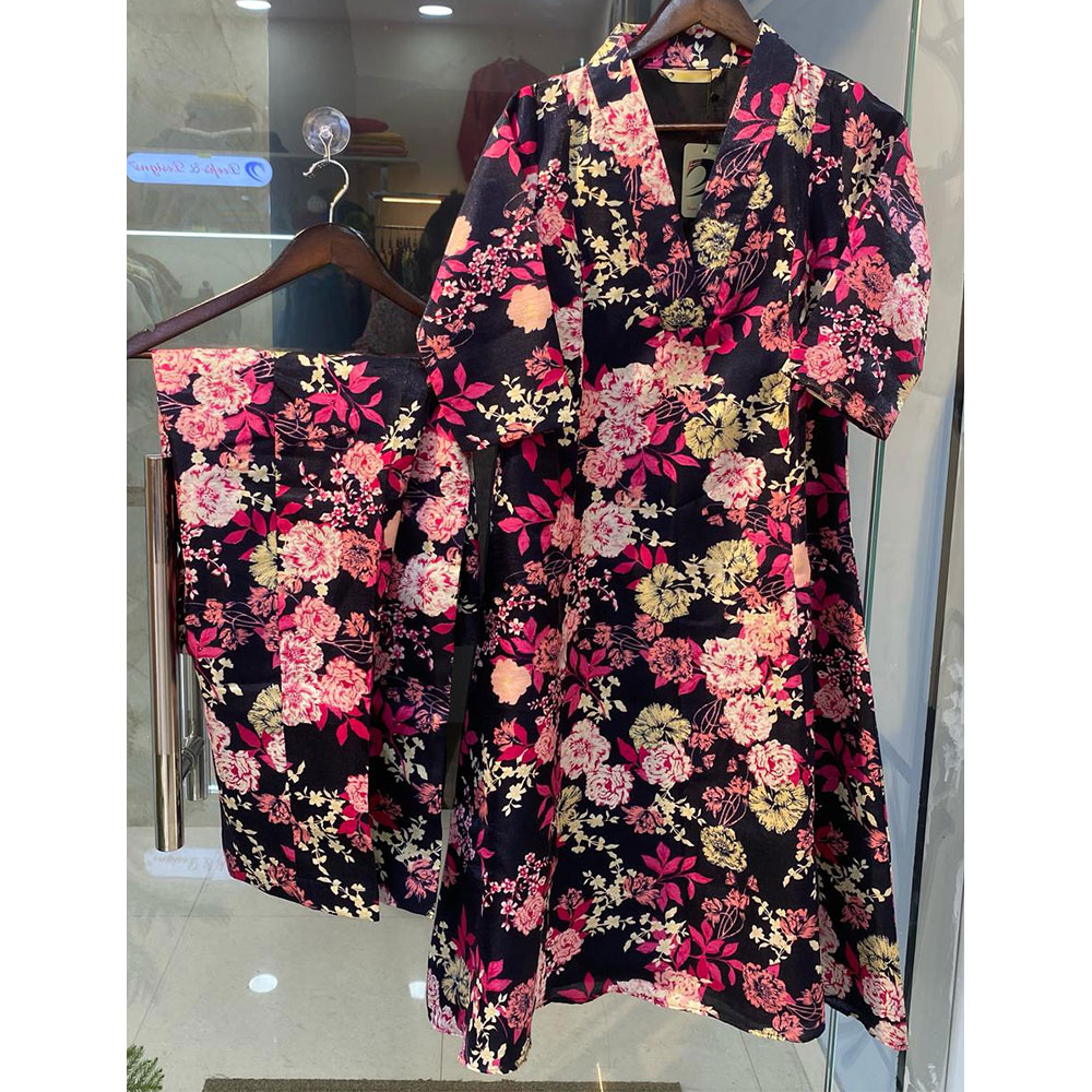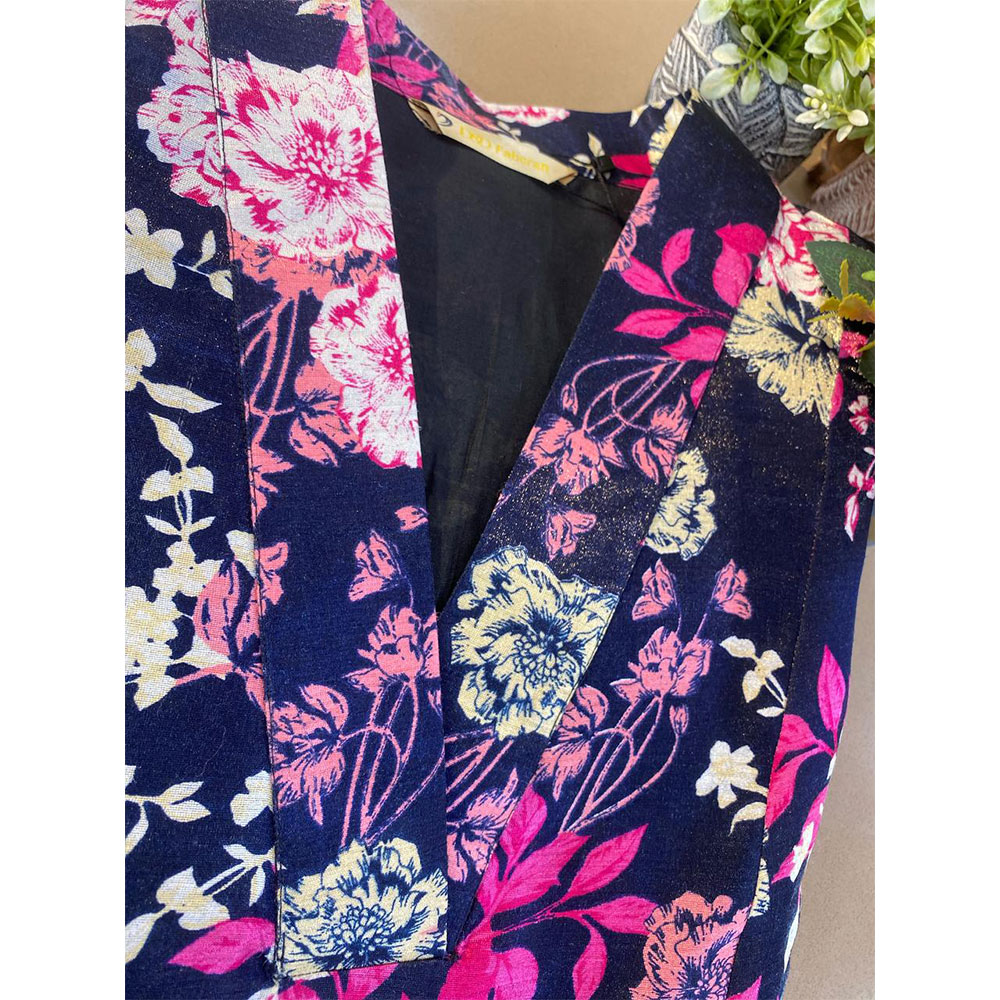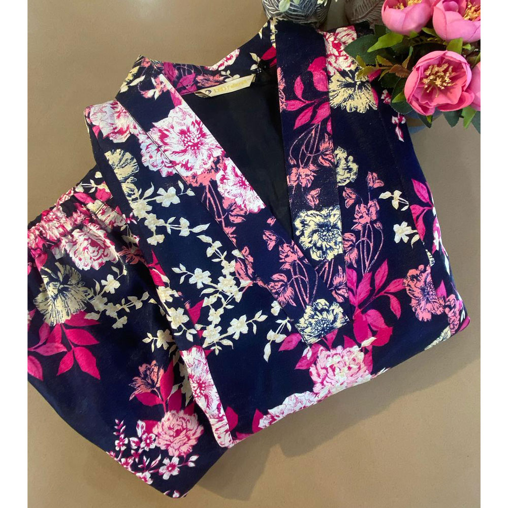 • Dark Navy  Blue With Pink , Magenta Floral Printed Kurta With Bottom