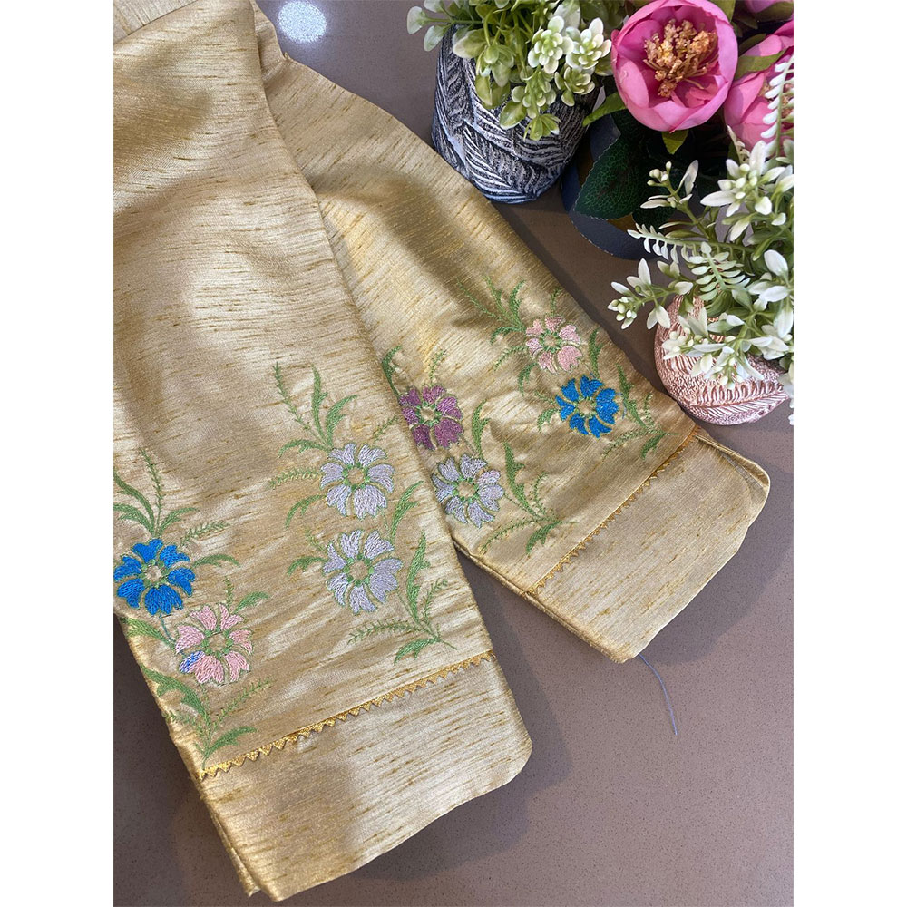 Golden Silk Plain Kurta  Computerized Embroidered  Sleeves