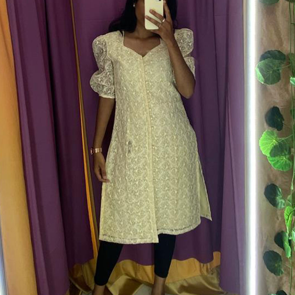 White Thread Work Ivory Kurta With fabric Buttons