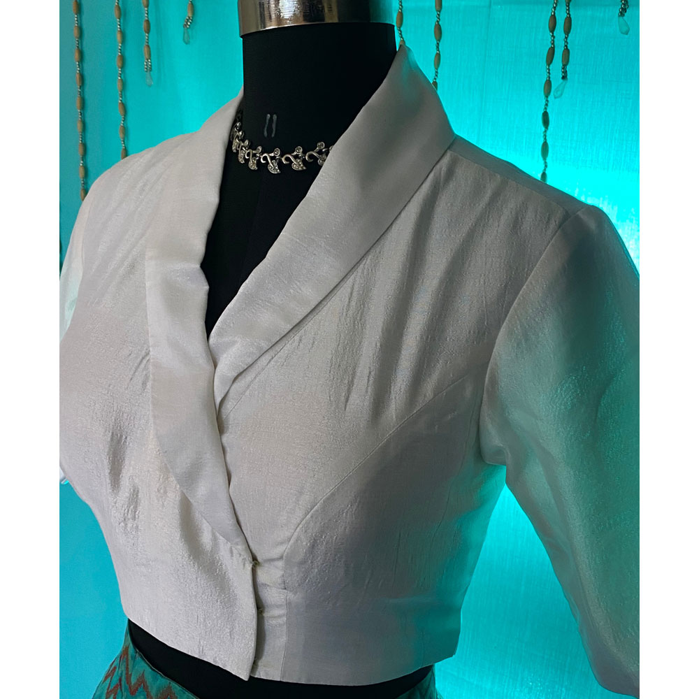 White ready to wear blouse, has a Collared neck, Short Sleeves ,Front Hook closure, Crop Top