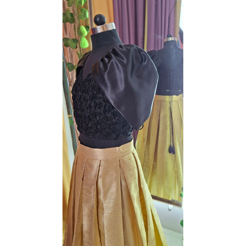 Black and gold-toned Floral lehenga choli, has Floral Appliques details